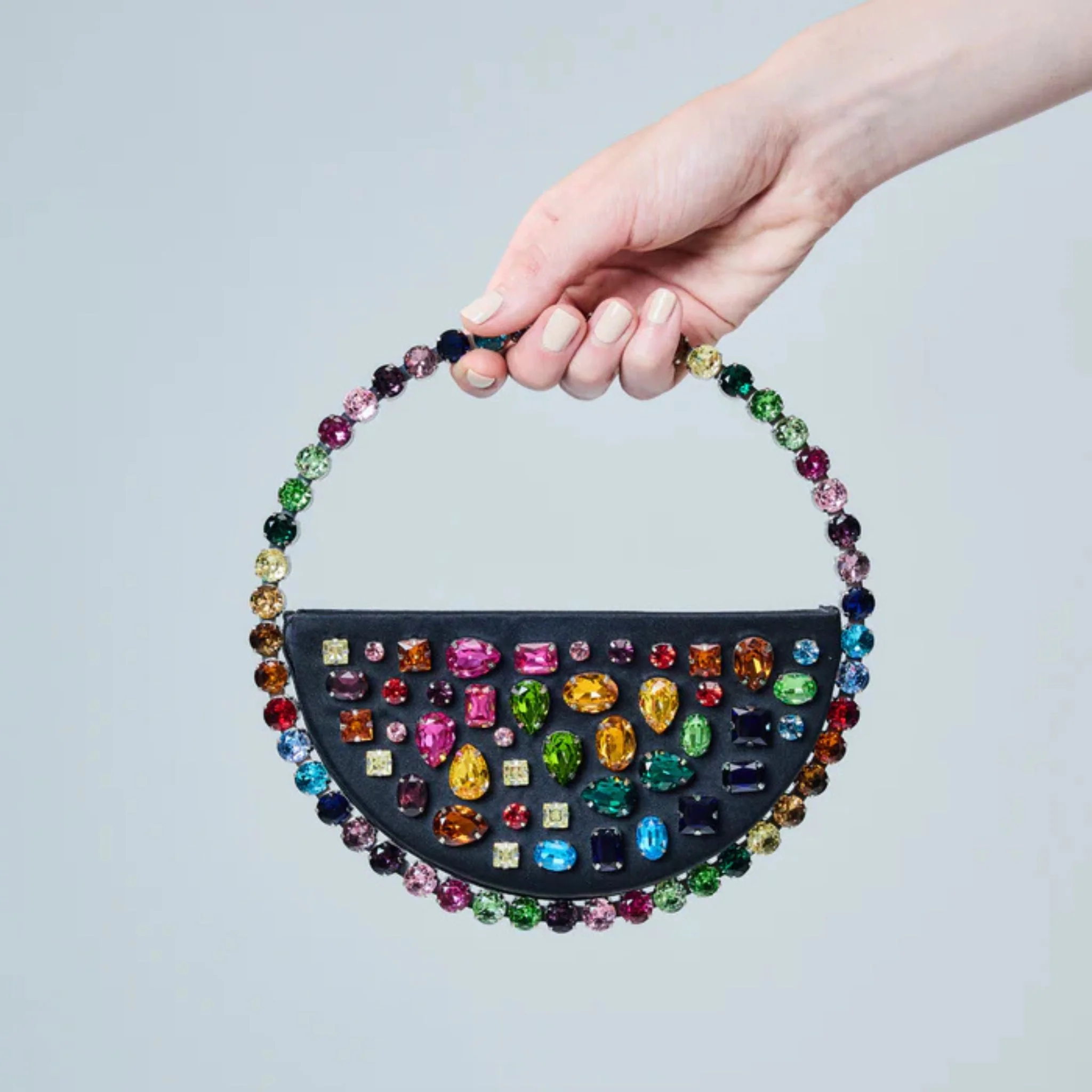 The Rainbow Stones Eternity Clutch from L'alingi is hand‑embellished with vibrant, jewel‑toned crystals in varying shapes and sizes. A truly radiant, sculptural, wearable artwork that transforms any look into a statement.