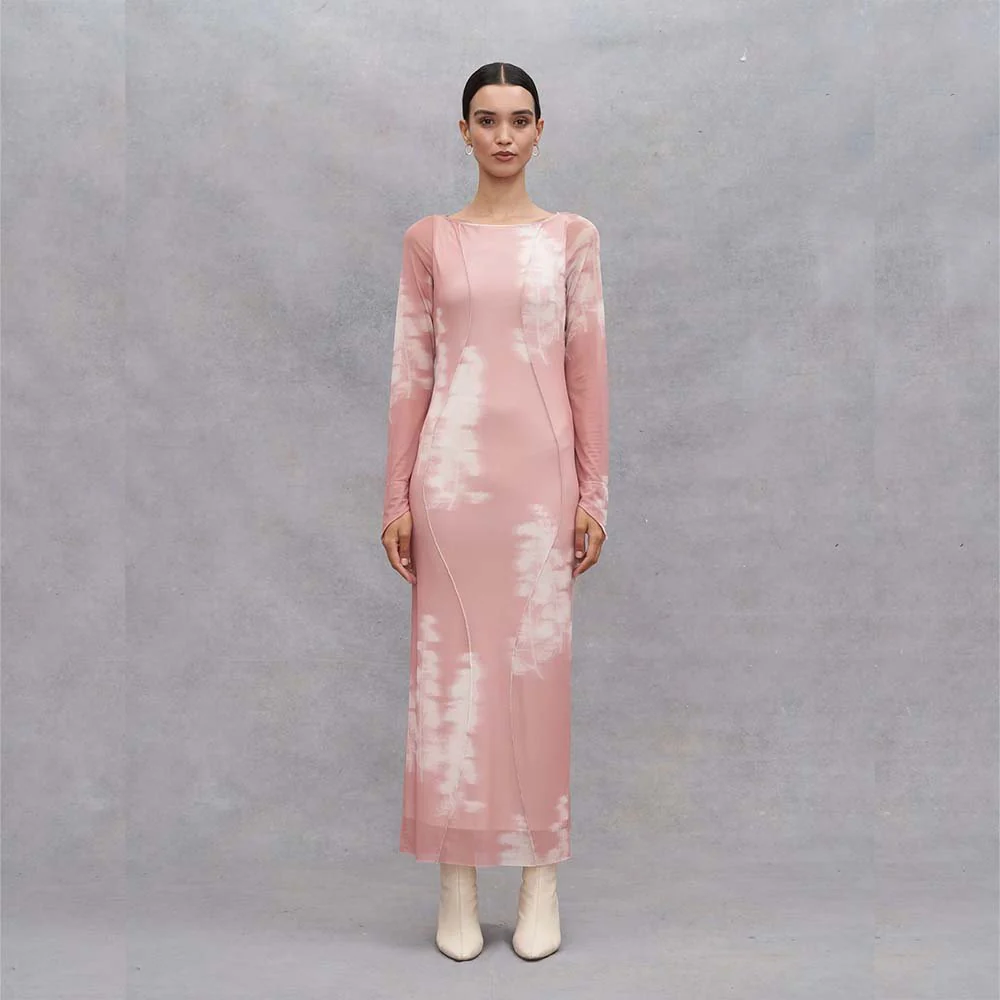Long dress with long pointed sleeves and boat neckline, Eva model, in Oeko-Tex® certified stretch tulle lined at the body level with the Abstract print in Misty Rose and Tofu colors.