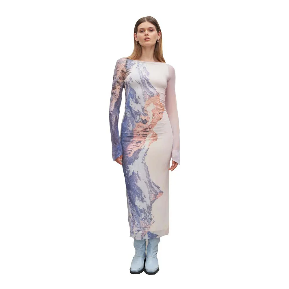 Long dress, fitted close to the body, with boat neckline and long pointed sleeves, Sartene model, in lined Oeko-Tex® stretch tulle (except on the sleeves) decorated with the Reborn print. Popular for the Corsica collection, the Sartene dress returns to the forefront, this time showcasing the Reborn print, emblem of the new collection. This print features a mountain landscape lulled by the warm light of the rising sun and reflected in a body of water. The call of nature comes to life through this poetic motif of introspective contemplation.