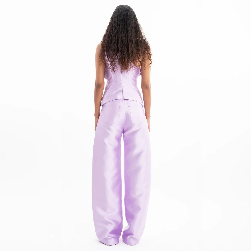The Lilac Heavy Satin Boyfriend Trousers offer the ultimate in luxury. Designed with a relaxed boyfriend fit, five-pocket construction, and a raw hemline, they combine style and functionality. Versatile and effortlessly chic, these trousers make a sophisticated addition to any wardrobe.