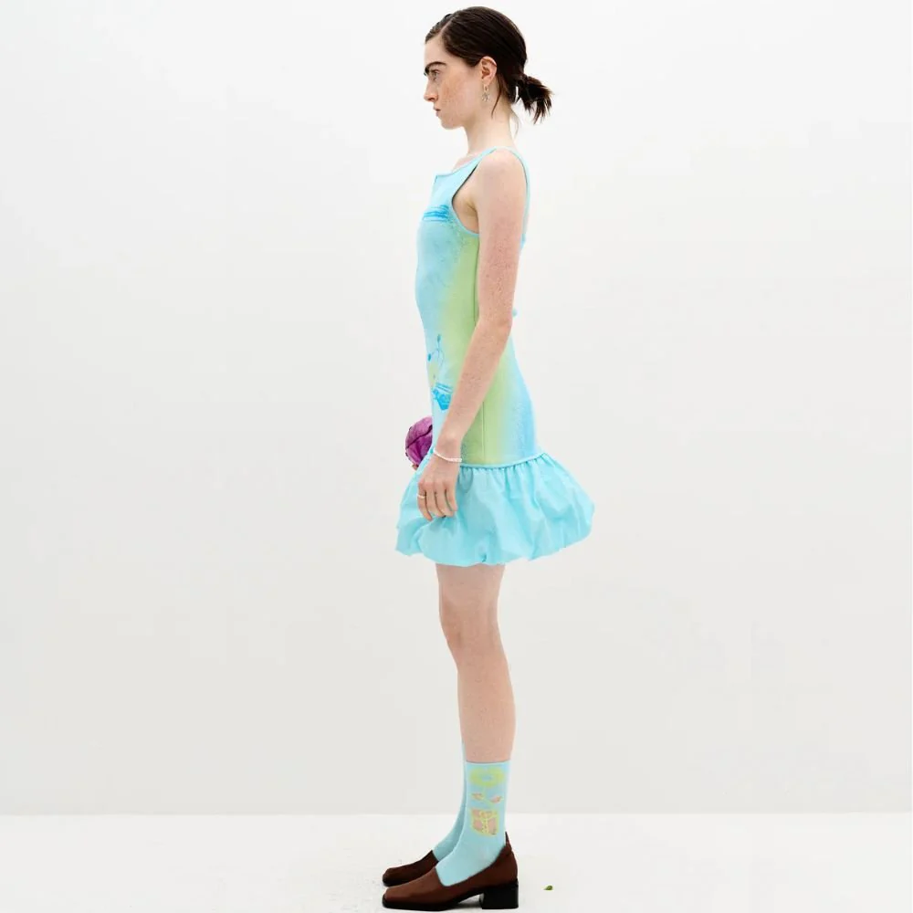 The mixed media reversible tank dress from PH5 merges structure with fluidity. Incorporating textured, feathery cotton yarns, it mimics natural elements like grass and moss, grounding the piece in the earth. Trompe l’oeil utility details evoke activism, with symbolic flower cuttings and tools peeking from faux pockets. The dress offers a balance of form and function, capturing the collection’s dedication to environmental awareness through design.