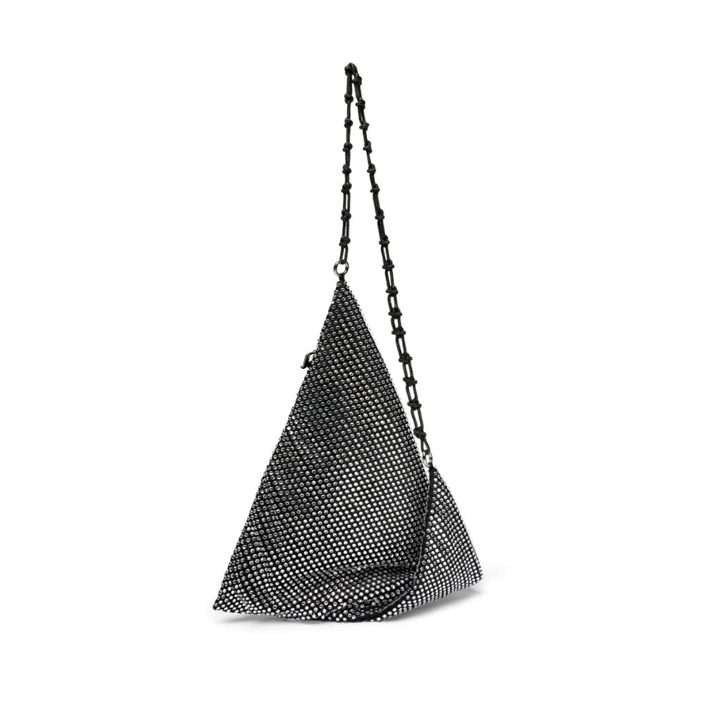 Handcrafted from soft satin fabric studded with a network of tiny crystals, the "Vela" bag, with its geometric silhouette, adds a touch of glamour to any look. It features a distinctive concealed side zip closure. It can be worn over the shoulder thanks to an elegant handle studded with micro crystals.