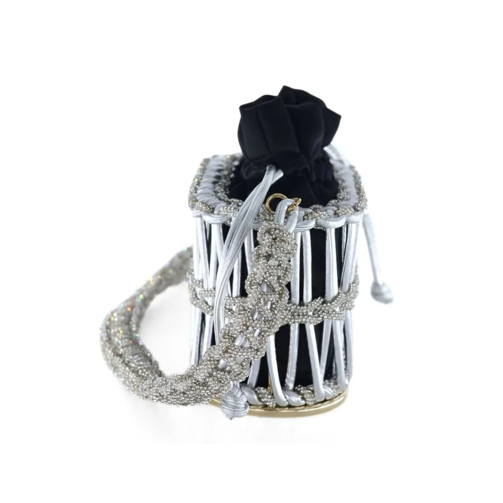Rosantica Mini Holli Vertigo Bag features a golden base and eco-leather tubes wrapped in silver brass, with intricate handwoven details of small transparent crystals by expert craftsmen. The black satin fabric is finished with a drawstring closure, and small transparent crystals wrapped around the handle for an elegant touch.