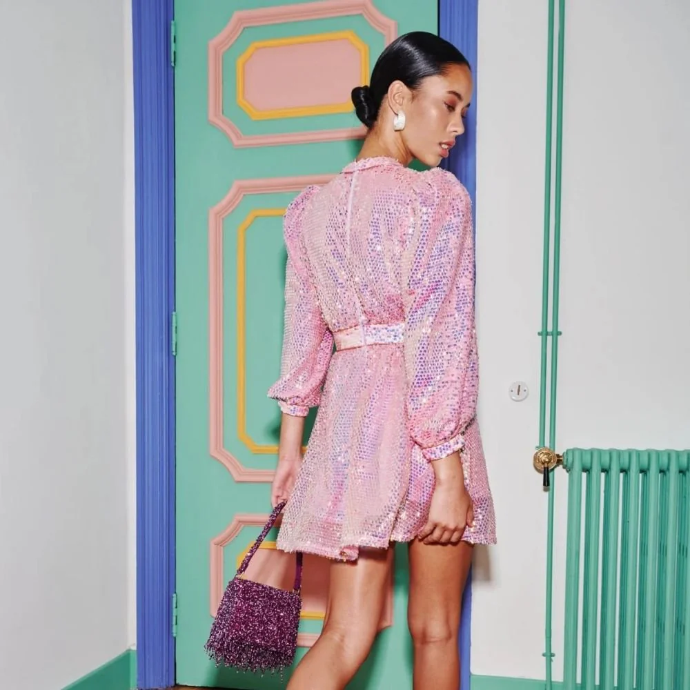 Sparkle in our iconic sequins party mini dress. The cinched waist and long sleeves make for a very elegant and glamorous look.
