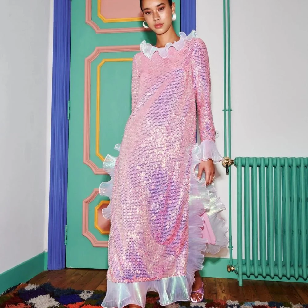 Our iconic, swoon-worthy dress reimagined with pink sequins and iridescent ruffle trim. Super flattering for all shapes, feel comfortable and look amazing in this long sleeve, zip-up dress.
