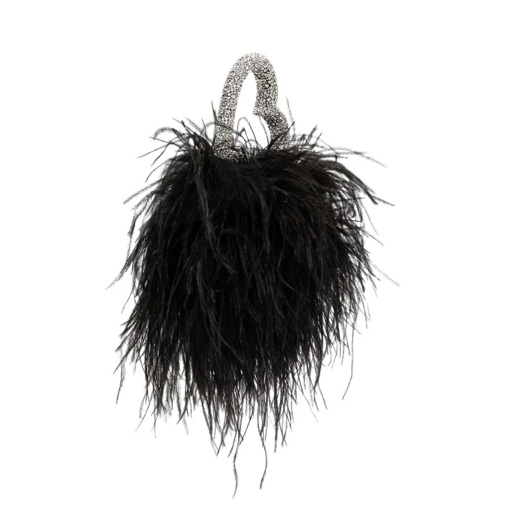 A flirtatious twist on the classic feather pouch from L’alingi. Embellished with a heart-shaped handle, the Black Love Feather Pouch bag exudes whimsy and elegance. With its midnight feathers and stylish accents, it's the perfect accessory to elevate your most fabulous ensemble.