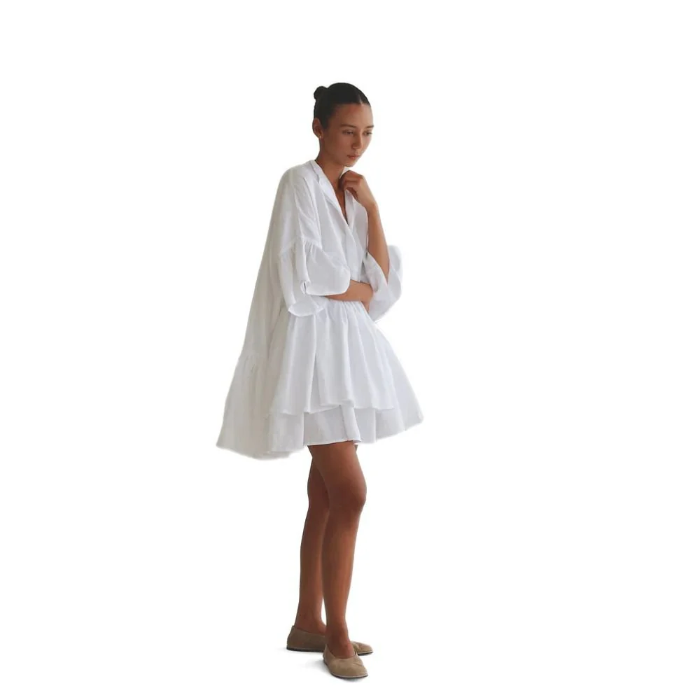 The Tilda Smock Dress from Morton Mac, linen smock dress with a double front frill. Concealed half button closure to the front with mandarin collar. Oversized shape can be brought in to highlight the waistline with included linen tie.